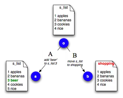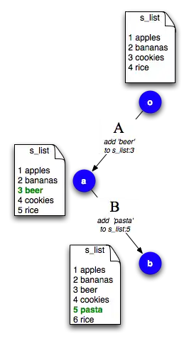 Consider a variant of the example above. As usual, Arjan adds beer to the shopping list. Next, he decides to add some pasta on line 5 of the file: