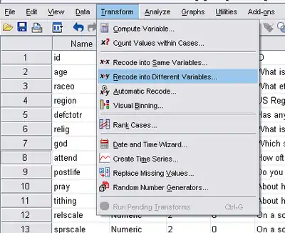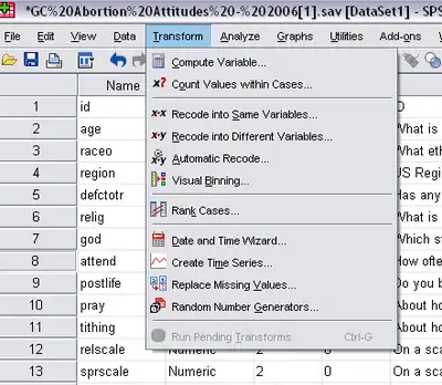 It is time to actually perform our recode. Drop the “Transform” menu at the top of data editor window: