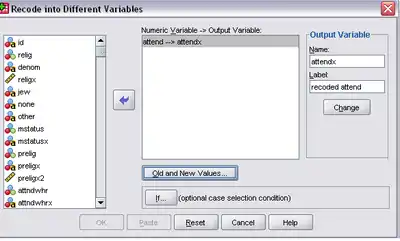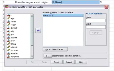 You will now see the “Recode into Different Variables” window. Choose the source variable from the list on the left and click the arrow (which then points left) to insert the variable into the “Numeric Variable → Output Variable” box. In this example, variable "attend" is selected for recoding: