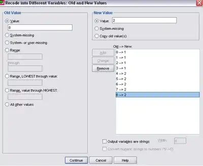 For each row of our table at top, enter Old Values on the left, New Values on the right and click “Add”. That will put them into the “Old → New” list. As you can see, our screenshot shows original values 0 through 3 have been recoded as “1.” Values 4 through 8 have been recoded as “2” in the new variable. These recodings could have also been specified as ranges, by selecting the radio button next to “Range” and entering a range of source values.