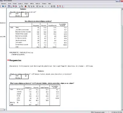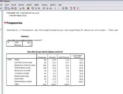 The new frequency table for the variable “relig” should pop up in your output box. Voila! You have successfully run a small computer program using SPSS syntax. Your output window will now have frequencies for both variables and should look like this: