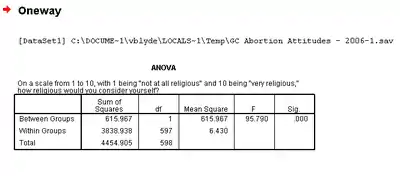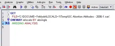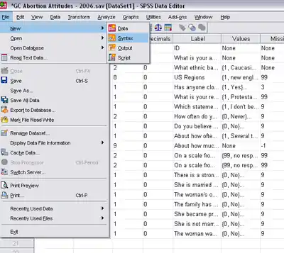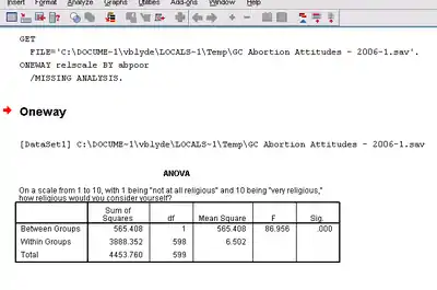 This same idea of copying the syntax and using it in the Syntax Editor to quickly run repetitive tasks can be illustrated using several of the variables in the example data set. Let's pretend you want to know if the religiosity of genetic counselors varies by their attitudes towards women obtaining abortions. In our sample data set there are seven variables examining attitudes toward abortion, each for a different reason. You could run the ANOVA seven times, pointing and clicking through the menus each time for each of the seven abortion attitudes variables. Or you can run it once, copy the syntax, paste it six times into the Syntax Editor, and simply replace the independent variable with the other six abortion attitude variables.