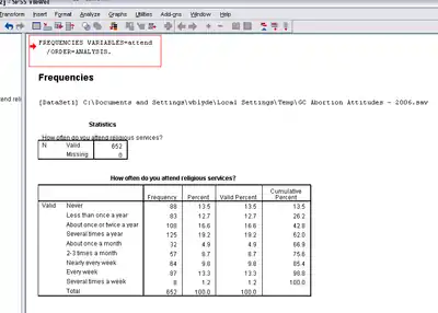 Returning to the example... Since we want to run the frequencies on the variable “relig,” we can start by returning to the original output window where you can copy the syntax from your original command just above the frequency table. The syntax is located in the red box below: