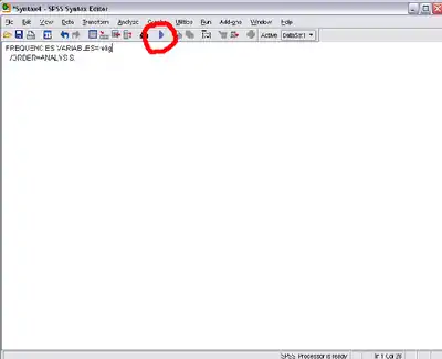 Now, erase the word “attend” and replace it with the word “relig,” which is the name of the religious affiliation variable in our example dataset, and click the blue arrow which tells SPSS to run the syntax. The blue arrow is circled below: