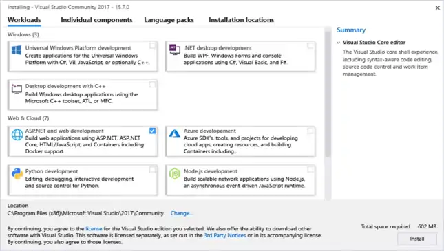 As you can see, Visual Studio has already selected a default list of options, which generally won't suffice for most. What workload you need depends on the type of development work you expect to do. For example, if you plan to make console C++ programs, you should select the Desktop development with C++ workload. The basic workload options are pretty self-explanatory.