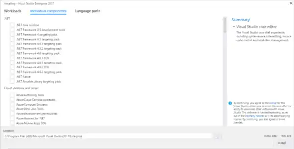But the default workload options may not be enough. For instance, you may want to develop programs for an old version of .NET Framework or want to include a specific debugging feature. That's where the Individual components options come into play: