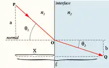 This is called Snell's law, and it governs how a ray of light bends as it passes through a discontinuity in the index of refraction. The angle is called the incident angle and is called the refracted angle. Notice that these angles are measured from the normal to the surface, not the tangent.