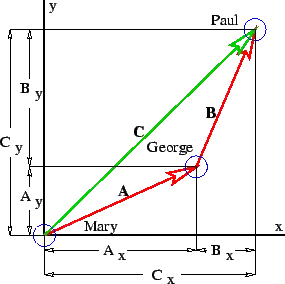 Vector represents the displacement of George from Mary, while vector represents the displacement of Paul from George. Vector represents the displacement of Paul from Mary and . The quantities , , etc., represent the Cartesian components of the vectors.