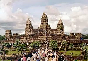 During the Angkorian kingdom the Khmer also built many fine stone temples. The Khmer were accomplished stone workers. One of the most famous of these temples is Angkor Wat. Angkor Wat, first constructed in the twelfth century, is the largest religious structure in the world. It has five large domes which are shaped like flower buds surrounded by terraces. Most of the temple is built from sandstone blocks. Carved reliefs in the walls show various religious scenes. The temple is surrounded by a moat.
