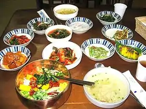 Korean food often has rice, vegetables, meats and tofu. Traditional Korean meals are served with many side dishes (called banchan in Korean.) Most meals are served with steamed short-grain rice. Korean food is usually seasoned with sesame oil, doenjang (fermented soybean paste), soy sauce, salt, garlic, ginger and red chili paste (gochujang). Korean food has a lot of garlic compared to other Asian foods.