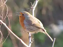 The European robin (Erithacus rubecula) is a species of bird that is mainly brown with a red or orange breast. They have white feathers under their red ones. They have a twittering song. In Europe, they are known simply as 'robin' and should not be confused with the North American Robin. They are also called the 'gardener's friend'.