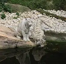 White tigers are those who are born with a certain genetic defect causing loss of pigment in their skin, eyes and fur. These tigers can be white with black, grey, very dark blue, or no stripes; they are not albino.