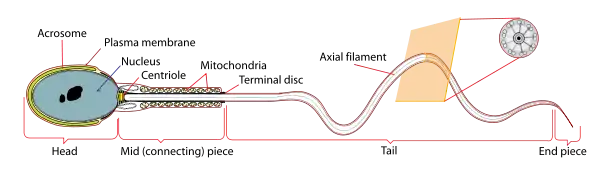A human sperm cell carries its chromosomes, found in the nucleus, to an egg cell in order to make a new baby. It has a large tail called a flagella that helps it to swim. It also has many organelles called mitochondria that give it power like gasoline gives power to a motor.