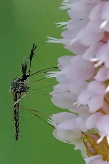 Both male and female mosquitoes drink nectar from plants as their main source of food. In many species of mosquitoes however, the females drink blood! A female mosquito uses the blood to gain other nutrients for her eggs. Using the proboscis, the external organ for sucking up blood, the mosquito punctures the skin of its victim. After injecting a pain killer, it will suck up the blood. A mosquito has special saliva that keeps the blood it drinks from clotting. Many diseases, such as malaria, are spread by mosquitoes carrying infected blood.
