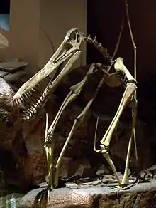 As well as flying probably very large distances due to the different atmospheric content (dense oxygen-rich atmosphere). Pterosaurs could move on the ground and needed to as to be able to take flight. For a while scientists didn't know if this was using two feet (bipedal), or using four feet (quadrupedal). We now know that they used four, from fossil footprints. However, we don't know if they did this all the time. Some scientists think that small Pterosaurs could walk or even run on two feet, but larger ones used all four like bats do now.