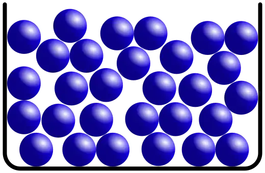 In solids, the particles are cramped together tightly in regular positions, and they can only vibrate (wobble) a little, but in fixed positions. Their positions cannot change freely, as a result. |