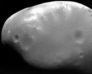 Deimos is one of the smallest moons in the solar system at only 12 km in diameter, or about 1/2 the diameter of Phobos. Surprisingly, however, Deimos was spotted and identified as a moon before Phobos, partly because of its greater distance from Mars, which meant that it was not so hidden in the glare of Mars' light. The surface area of Deimos is roughly the size of a medium-sized city on the Earth. It is also very irregular in shape, due to its small size.