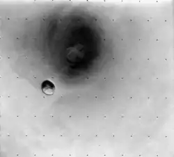 Phobos in orbit above Mars, as captured by the Viking-2 orbiter, above the Martian volcano Ascraeus Mons