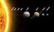 The eight planets of the Solar System, and the sun. Sizes are to scale, but distances are not.