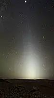 In between all the other things is dust. The pieces of dust are very far apart, but they shine in the light of the Sun. Before dawn, in September or October, they glow in the East. We call this the zodiacal glow, or zodiacal light.[7]