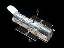 The Hubble Space telescope is a giant telescope that is in orbit around the Earth. Because there is no atmosphere, the Hubble Space Telescope has a clear view of even distant galaxies. One of the pictures the Hubble space telescope has made is called the 'Hubble Deep Field'. The Hubble Deep Field is a picture of some of the most distant galaxies, and it gives a snapshot of what the universe looked like when it was younger.