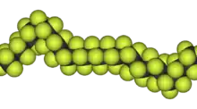 Teflon, the non stick material found in frying pans, is a polymer that is 75% fluorine by weight. The scientific name for Teflon is polytetrafluoroethene, or PTFE. This is a chain of carbon atoms with two fluorine atoms attached to each carbon atom.