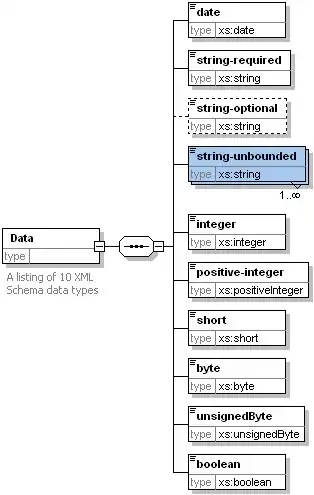 The following is an XML Schema diagram with data types visible. Note that the data type is displayed directly under the data element. This diagram also shows optional data elements using a dashed line and the cardinality of the data elements.