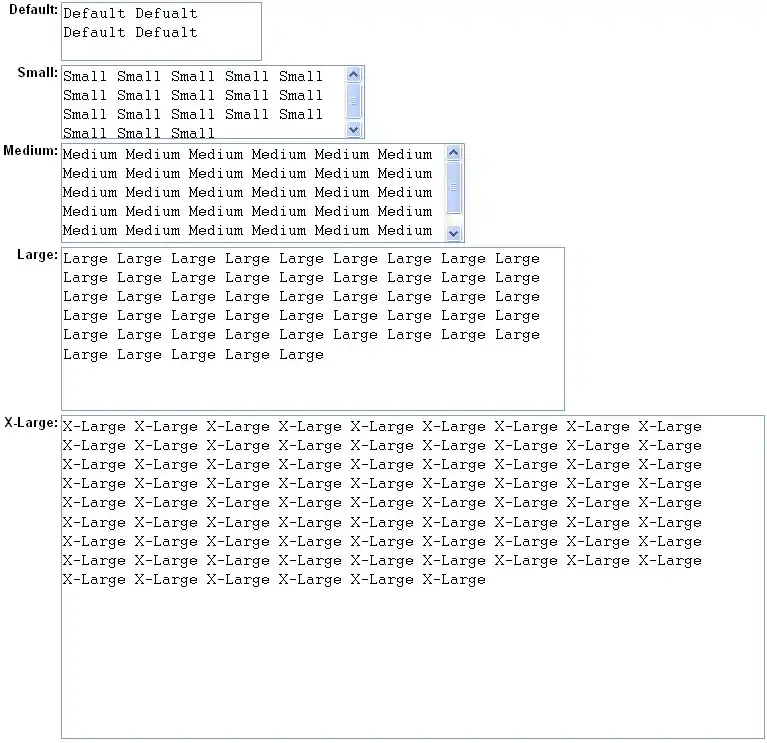 Here is a sample screen image. The example includes the default textarea and a small, medium, large and extra large version. Note that if the content exceeds the textarea a scroll bar is automatically added to the control.