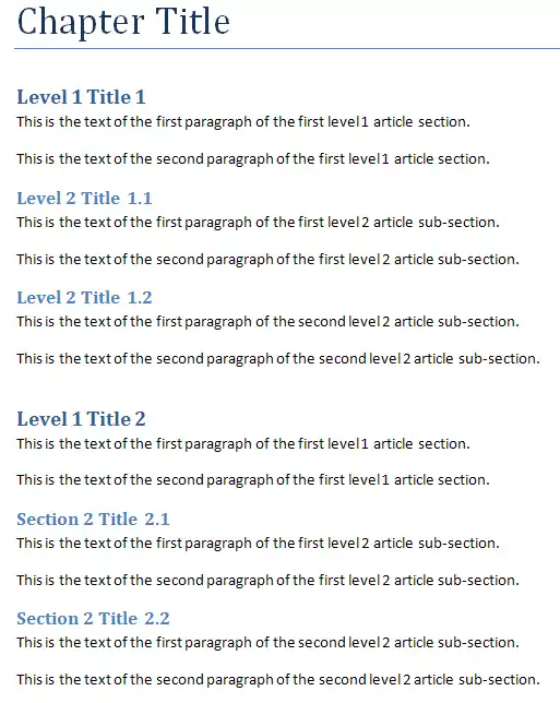 We will begin with a DocBook 5 chatper with a two level 1 sections that each have two level two subsections each with two paragraphs each.