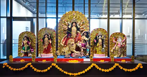 1. Durga Durga is the Goddess of power. She rides on a tiger (or lion). She has the force of a tiger within herself. What she decides to be her goal, she reaches it. She is a winner. She has many weapons around her, meaning, that she uses creative methods to reach her goals. We shake both fists near our head and think the word "power", until we feel the power of Durga in us. What are the goals in your life? In which way you can reach them? "My goal is ... My way to be victorious is ..."