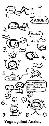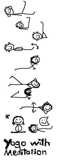 8. Meditation = We rise up in a sitting position (heel seat or cross-legged) and put the hands in our lap (or on the legs). The back is straight and the belly relaxed. We think the mantra "Om Shanti" until our mind comes to rest.