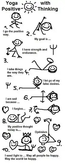 Yoga with positive thinking is very helpful for many people. It allows one to quickly overcome negative tendencies and reach a happy and healthy life. Positive thinking and daily meditation are the two basic techniques of enlightenment. All the negative characteristics are ultimately based on attachment (to external pleasures, other people, to his ego) or rejection (of suffering situations, pain). If we accept the suffering in our lifes and let go of our worldly desires and longings, the tensions in our minds resolve. Our inner happiness creates a positiv feeling of life. We get into a life in the light (in a paradise view of life). The main way to overcome the negative qualities is to focus on the positive qualities of wisdom, self-discipline, peace, love and happiness.