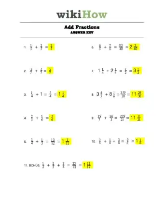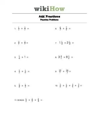 To add fractions, start by checking the denominator of each fraction to make sure it’s the same number. If not, multiply each fraction by the other fraction’s denominator to give them a common denominator. For example, when adding ⅓ and ⅗, your new denominator would be 15, and the new multiplied fractions would be 5/15 and 9/15. Once you have the same denominator, add only the numerators together, and put them over the new denominator. For the example, the answer would be 14/15. If you want to learn how to simplify your answers, keep reading the article!