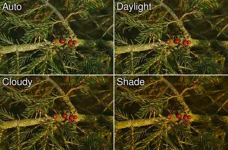 3Try your "Auto", "Daylight", "Cloud" and "Shady" white balance settings under daylight. Most of the time the colours will be too cool in "Auto", and you'll also find that things will look much nicer in the other settings. This differs from camera to camera; some cameras (specifically camera phones) have terrible white balance algorithms in some settings.[3]