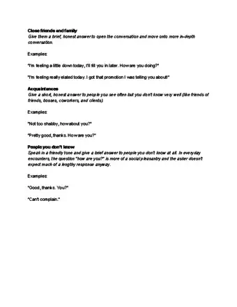 People ask the question “How are you?” in conversation as a way to greet you and engage with you. Answering this question can be tricky, and you may not be sure the best way to respond. In professional situations at work or with an acquaintance, you can give a brief, polite response. In other cases where you are talking to a close friend or family member, you can respond with a longer answer and engage them in a deeper conversation. With a few considerations, you can answer this common question correctly depending on the social situation you are in.
