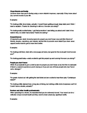 - In most cases, if you are among friends or family, giving a detailed response may be okay. If you are around coworkers, peers, or authority figures, a more polite, short response may be the way to go.