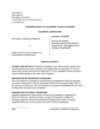 2Find a form. A Notice of Appeal is a very brief, simple document that simply informs your opponent and the court that you are going to appeal the judgment. Many courts provide a Notice of Appeal form, which requires you to fill in the blanks or check off boxes. After you receive your Notice of Entry of Final Judgment, you should ask the court clerk if a form exists.