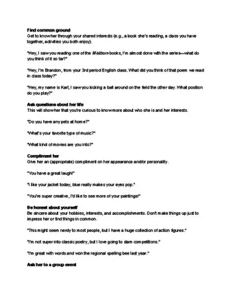 2Learn more by talking to her about her life. Ask her if she has any pets, what her hobbies are, and if she’s involved in any after-school groups. Don’t ask her for her number or say anything about dating right off the bat, because that may make her uncomfortable.[9]