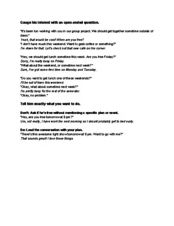 - Lead the conversation with your plans. Asking a guy if he’s free on a specific day without mentioning what you plan on doing makes it hard for him to determine if he’s interested.