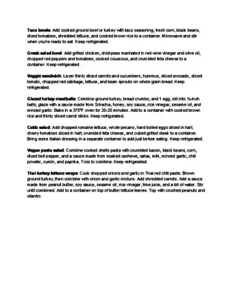 - Always make sure to pack lunches that have lean protein and fruits or vegetables. The combination of these foods will keep you satisfied throughout your long work day.