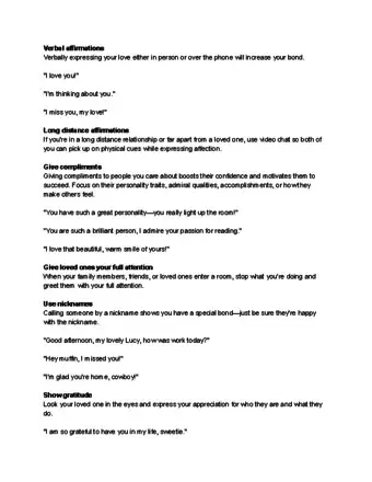 1Give verbal affirmations. Giving verbal affection, such as saying, “I love you” or “I care about you”, is an important way to strengthen bonds and is even good for you physically and mentally.[12] Don’t let texting or emailing the ones you love replace verbal affection. If you are apart, then pick up the phone to check in because it’s more personal, even if it takes more time.