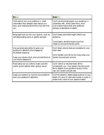 - Keep in mind that there may be technical issues and you may not be able to access a powerpoint or prezi. Make sure you can deliver your speech without these things, if necessary.