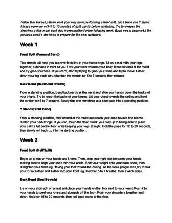 5Practice full splits. The splits will help you stretch your leg and hip muscles. Depending on your level of flexibility, you may be able to only go halfway down in the splits or you may be able to touch the ground in the splits. If you are still working on getting all the way to the ground, you should continue to work on your splits as part of your daily stretching routine.[5]