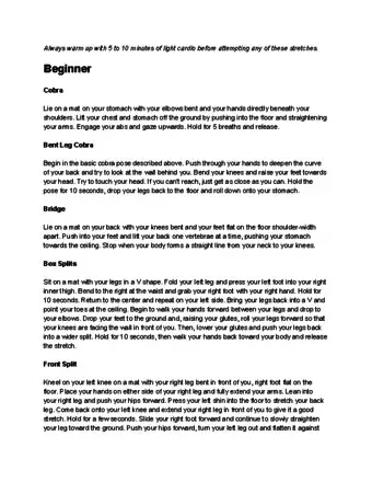 2Warm up before you do any stretching. Make it a habit to always warm up before you get into any contortion stretching. This will prevent you from getting injured and allow your muscles to warm up and become more flexible.[2]