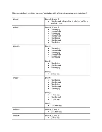 - Week 8: Brisk five-minute warm-up walk, then jog 2.75 miles / 4.4 kilometers (or 28 minutes).