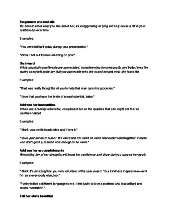 - Give her compliments that uniquely describe her. "You're funny" is a generic compliment that is easy to shrug off. "Your sci-fi satires are hilarious" is much more specific, and is harder to discount.