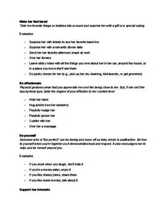 1Make her feel loved. This can be done by giving her little gifts you find when you’re out and about. You might also give her flowers, text or call her randomly during the day, make her food, take photos to say "This reminded me of you," or plan a special date.[4]