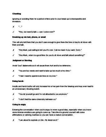 - Don't suggest a "break." Breaks are usually just a segue into a full-on breakup; if you feel that you need a break from the person you're with, then chances are that you actually want to break up but are too afraid of being alone. Rather than asking for a break, wait until you're ready to fully end the relationship and then do it.