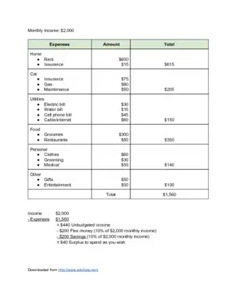 5Compare your expenses to your income. To make your monthly budget, add up the total amount of money you spend every month from fixed and variable expenses. Then, subtract that amount from your monthly income. Whatever you have left over is your disposable income, or money that you have left at the end of the month. If you don’t have any money left or the number is negative, you’re probably spending more than you make each month.[9]