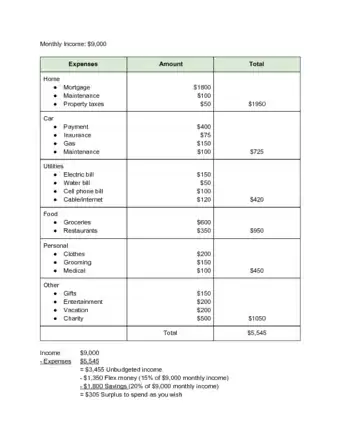 - For example: $600 (fixed expenses) + $550 (variable expenses) = $1,150 per month. $2,000 (monthly income) - $1,150 (total expenses) = $850 disposable income.